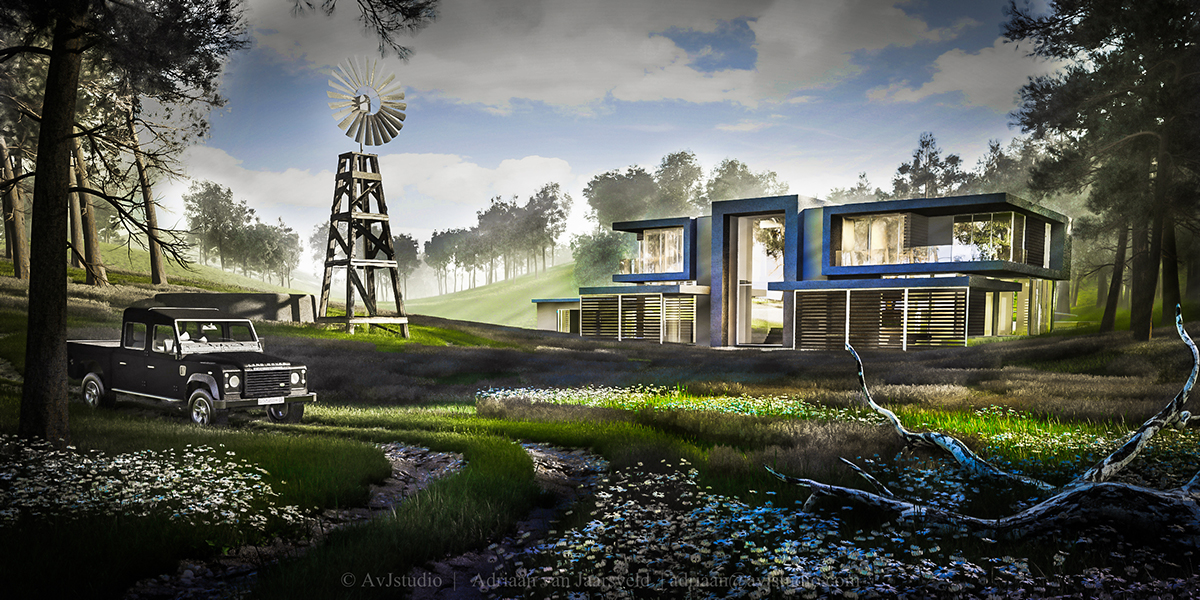 This image showcase a house in a clearing. This image is a 99% 3D production. Please contact Adriaan should you require 3D visualizations.